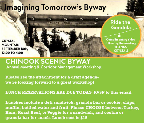 If you're interested in being a part of Imagining Tomorrow's Chinook Scenic Byway - please join us on September 18th at Crystal Mountain for our annual meeting and workshop - to kick off our planning for the new Corridor Management Plan. For more info
